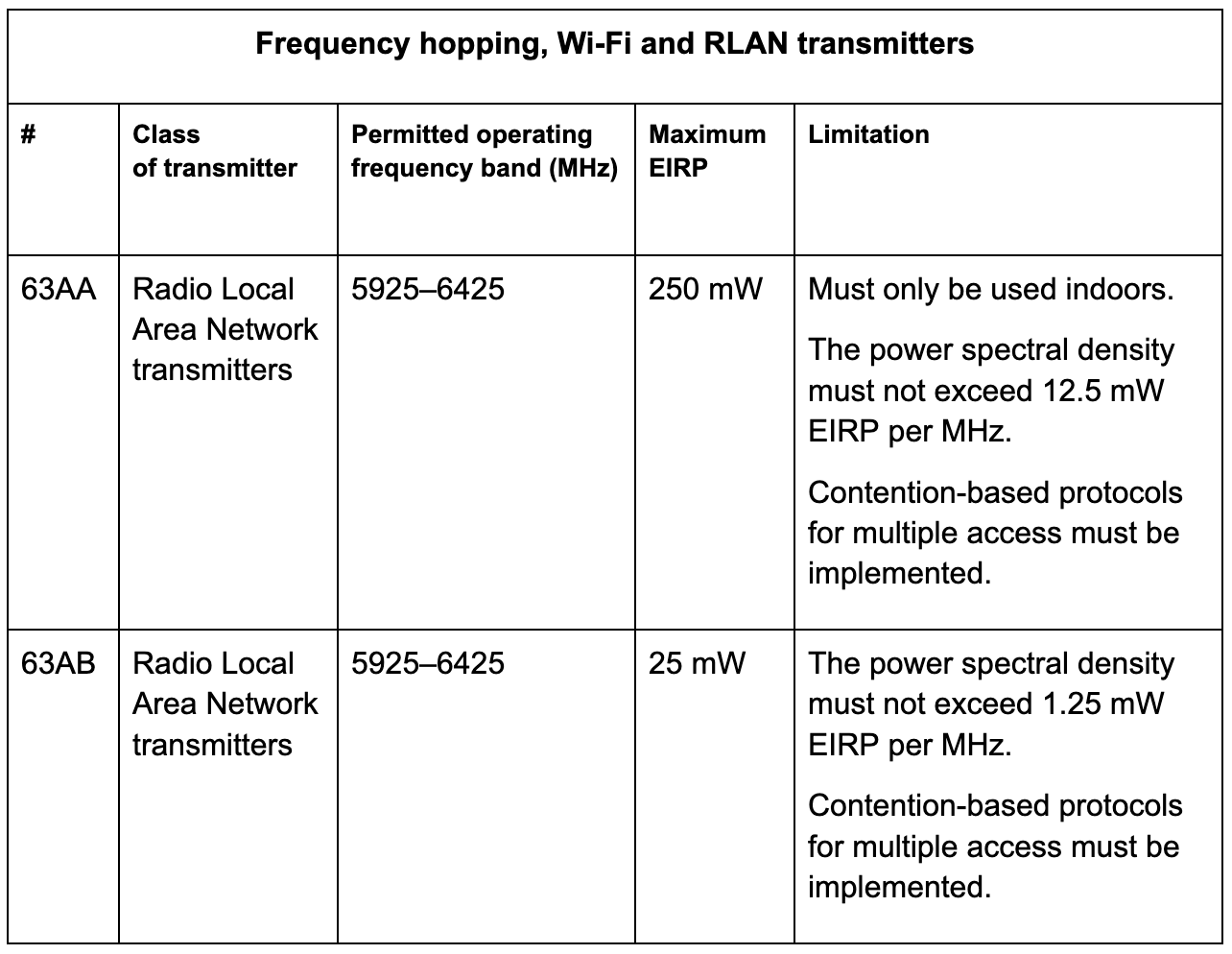 目前的文件增加了一個新的頻段:5925-6425MHz,用于無線電局域網(wǎng)發(fā)射器在低功率水平下的運行,并糾正了以前在載波頻率方面的錯誤。