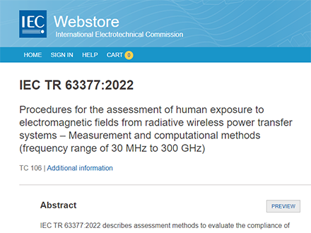 2022年11月4日,國(guó)際電工委員會(huì)(IEC)發(fā)布IEC TR 63377:2022《人體暴露于輻射式無(wú)線(xiàn)電能傳輸系統(tǒng)產(chǎn)生的電磁場(chǎng)的評(píng)估程序-測(cè)量和計(jì)算方法(頻率范圍從30MHz至300GHz)》。