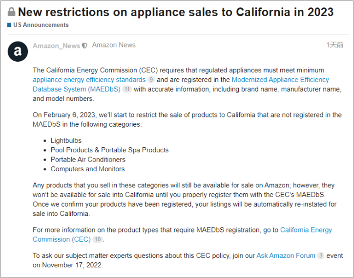 以上必須滿足CEC Title20電器能效標(biāo)準(zhǔn)要求,并在CEC能效數(shù)據(jù)庫系統(tǒng)(MAEDbS)中注冊列名,注冊信息包括品牌名稱、制造商名稱和型號等。也就是說以上品類必須滿足CEC Title 20 能效認(rèn)證,并在CEC 能效數(shù)據(jù)庫系統(tǒng)(MAEDbS)中注冊。如無CEC MAEDbS注冊的將無法在加州銷售,一旦賣家完成MAEDbS注冊將自動恢復(fù)銷售。